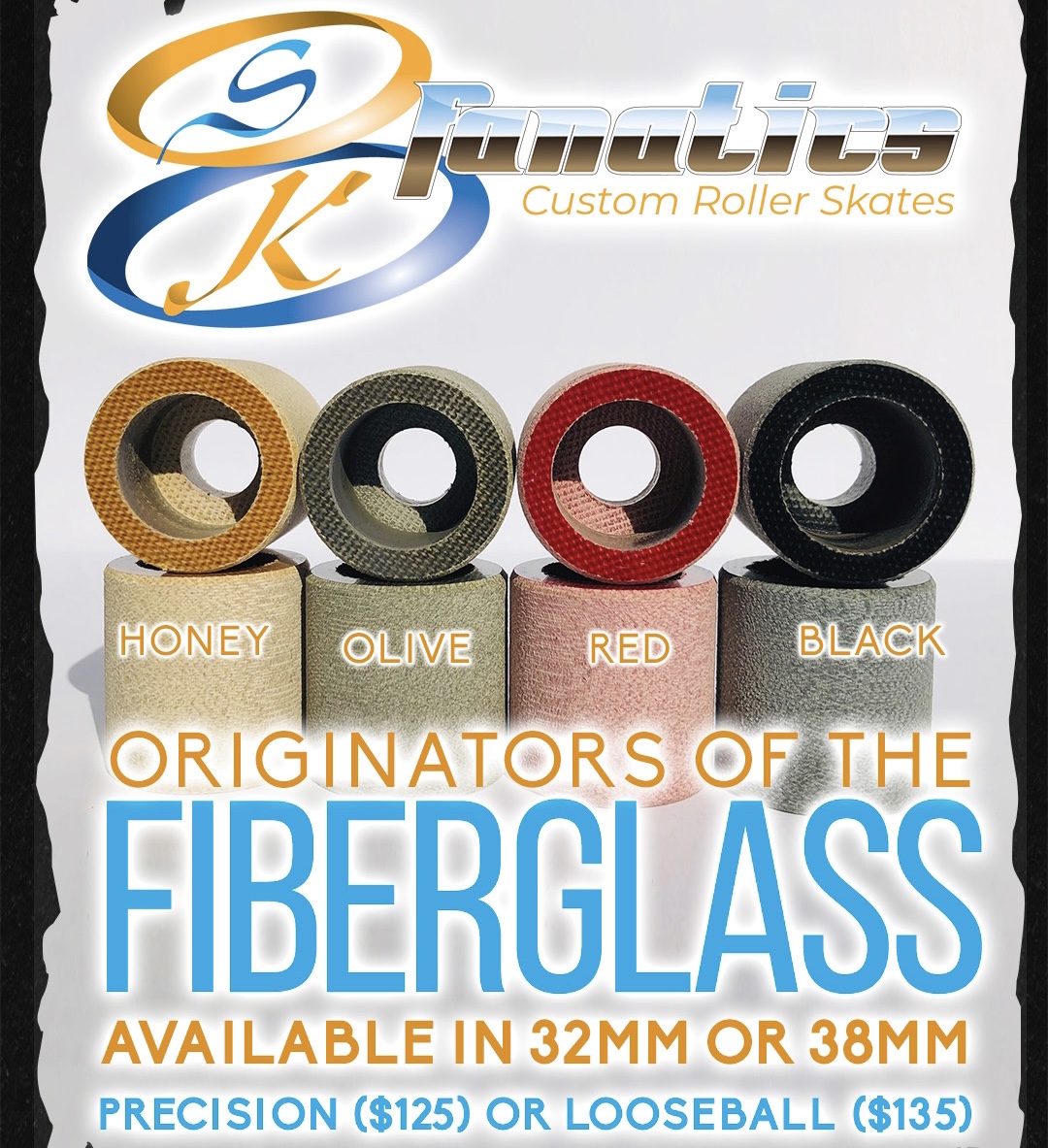 “Fiberglass” (aka fibers) is like skating on glass or ice. They are the hardest, most slippery wheels made for sliders and experts only. These wheels come in 4 other colors: honey brown, black, red and olive.