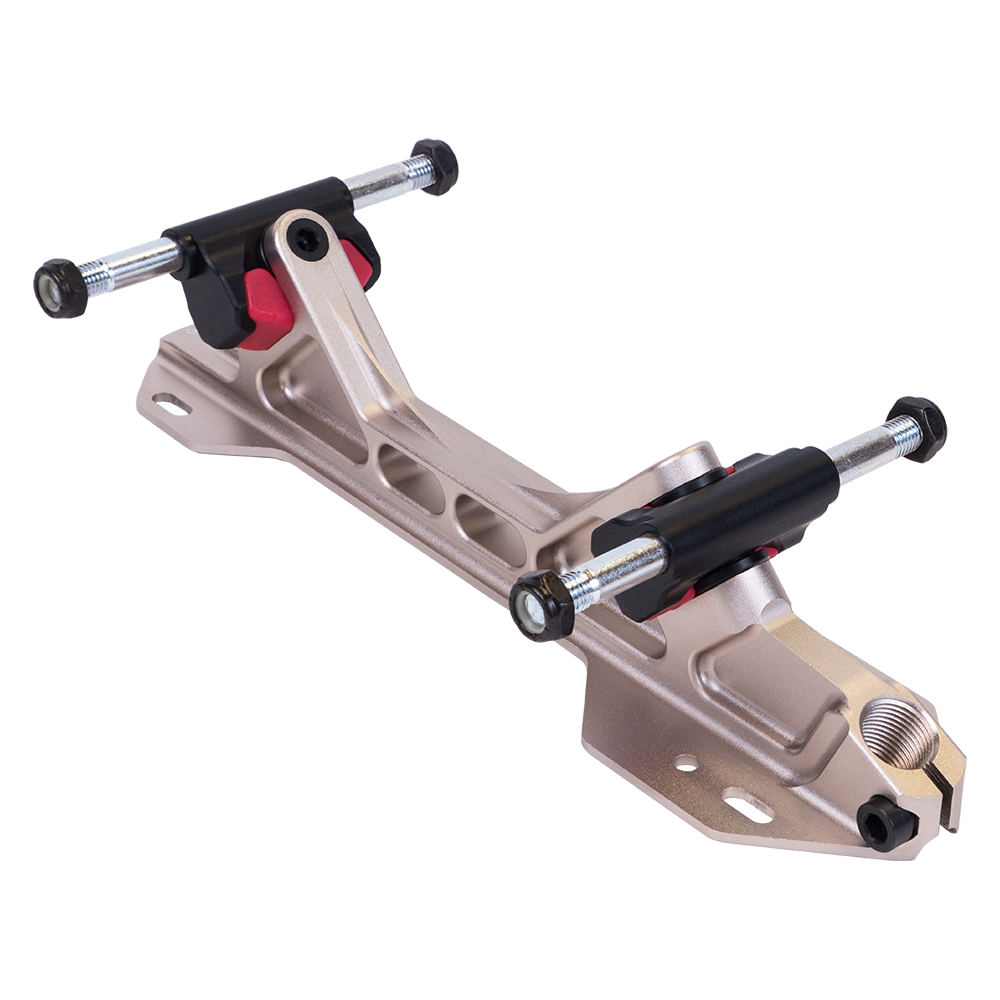 The PowerDyne Arius Platinum takes the roller skate plate to the next level. The Arius Platinum features the same revolutionary design as the original Arius with upgrades in key areas that improve performance and ease-of-use. To start, the toe stop bolt is now found at the very front of the Arius Platinum, instead of behind the toe stop. This provides greater clamping power for secure stops, starts and other toe stop maneuvers. The trucks of the Arius Platinum also receive a significant update, with a “winged” truck body that securely holds the Split Butterfly Cushions in place with no need for any other stabilization or adjustment hardware. Finished in a brilliant platinum gold color, the Arius Platinum is lighter, stronger, more stable, more powerful, more maneuverable, more durable and more efficient than any other plate available today. Each Arius Platinum set comes with 4 sets of Split Butterfly Cushions so you can tailor your ride for your exact needs.